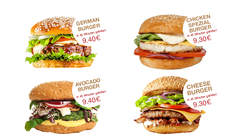 Und wonach ist dir heute? Beef oder Chicken? Greek oder German Burger? Was dir dein Bauchgefühl auch sagt: wir liefern es dir in 45 Minuten!